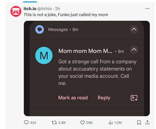 Funko called, not the creator of itch, but *his mother,* about "accusatory statements".
